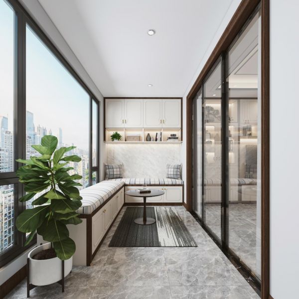 当然也可以利用阳台转角位置,为自己开辟一隅读书角,定制顶天立地式阳台柜,可以放一些日常打扫家务的清洁工具,从转角位置延伸出一张小书桌,用来阅读休闲,也是棒棒哒~