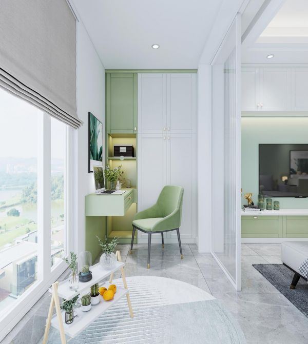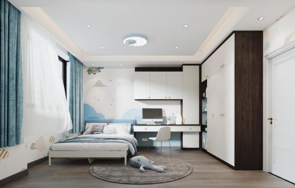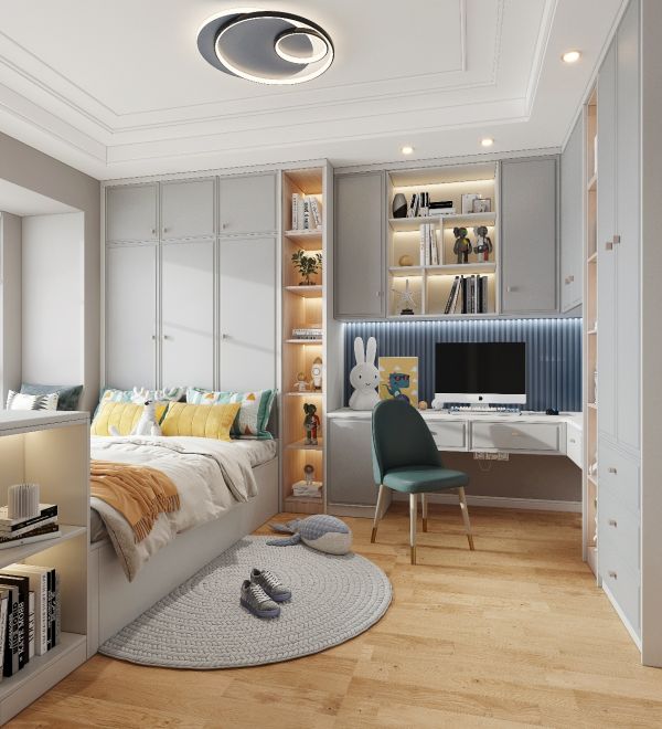 户型较大且不太喜欢榻榻米的朋友,可以利用卧室的转角位置选择“衣柜+书桌”的形式,在定制衣柜末端连接床头的位置,延伸出一张书桌,不仅可以作为梳妆台、床头柜,也可以作为简单办公阅读的学习区,一举多得哦~