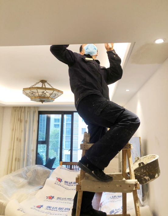 【▲“无痕”施工让明装更隐蔽】虽然是“明装”,却做得像“暗装”,骏达暖通对安装人员有“双重要求”,安装人员不仅熟稔采暖工程施工,同时也拥有多年的泥工经验,在凿开石膏板走完管线后,吊顶能达到百分百的还原标准,使其看起来毫无开凿痕迹。此外,设计师更有巧妙之处,从客厅到次卧的管线,在墙角开了一个斜角直接通到次卧,从而跨过了次卧旁边的储藏室空间,既节省了工序,更是最大限度避免了对墙体的伤害。
