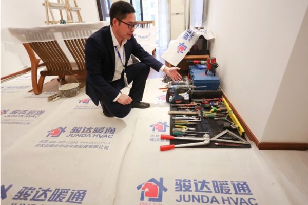 【▲保护严密彰显高端服务】除了施工技术上的无懈可击,骏达暖通对于现场的保护措施也做到了“严防死守”,地砖、地板、家具和电器均统一覆盖了保护膜,以避免对精装修造成任何可能的伤害或污染。此外,施工工具都在同一个区域摆放整齐,方便取存,从而提高了工作效率。