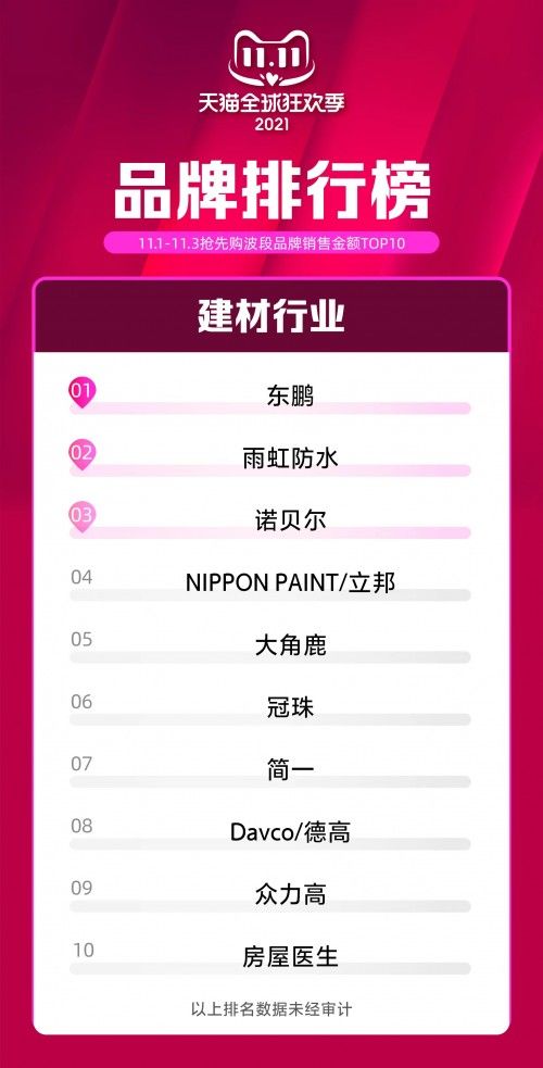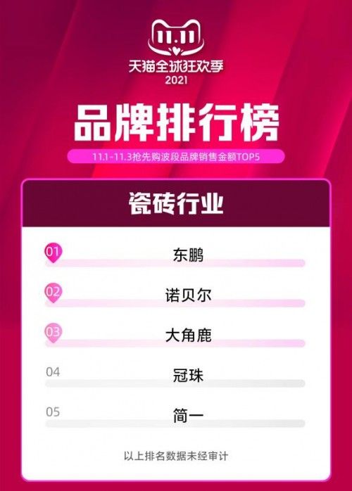 11月1日0点,东鹏瓷砖双11开售。截止11月3日24点,东鹏新零售再夺天猫瓷砖行业及建材行业双第一的桂冠,开门红首战告捷。
