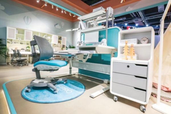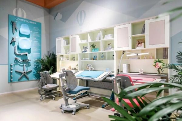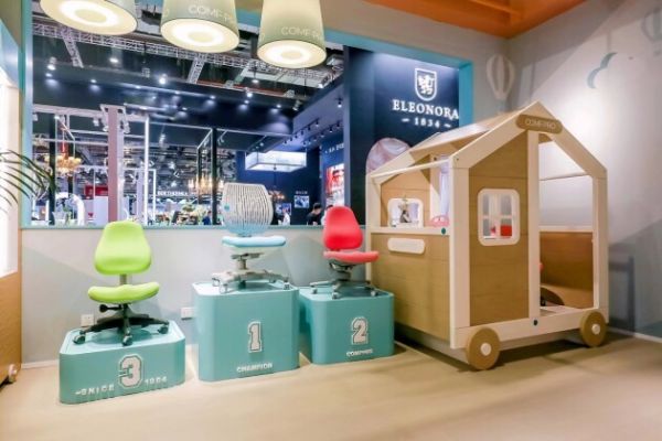 康朴乐COMF·PRO的展会面积比去年增加177%,以品牌蓝、水泥灰、焦糖棕色彩来精心打造展会空间,浅灰色水泥纹灰藻墙布饰底,品牌色与焦糖色时尚搭配,点缀科技感线灯,潮流不失经典,墙面采用插图风格元素装饰,彰显儿童家居丰富属性,呈现由单一功能儿童家具到整体儿童家居的转变,整体兼具美学颜值与温暖治愈感。
