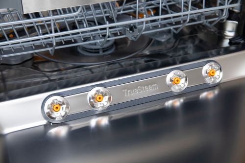 LG洗碗机在门板底部增加了四个蒸汽喷口,加入了100℃ True steam设计,工作时会喷射100℃高温蒸汽,清洁效果的确是好,洗好的餐具铮亮,简直比新的还新。