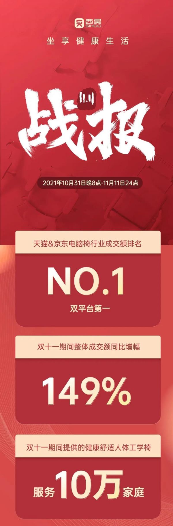 近几年大众的健康意识不断提升,人体工学家具市场发展也非常迅猛,随着双十一大战正式落幕,各大品牌也都交出了一份非常优秀的“成绩单”。据悉,作为人体工学家具领跑品牌的西昊,今年双十一在天猫京东双平台继续蝉联电脑椅单品、类目销售额等多项冠军,整体成交额同比去年增幅149%,累计为超10w家庭提供了健康舒适的人体工学椅。