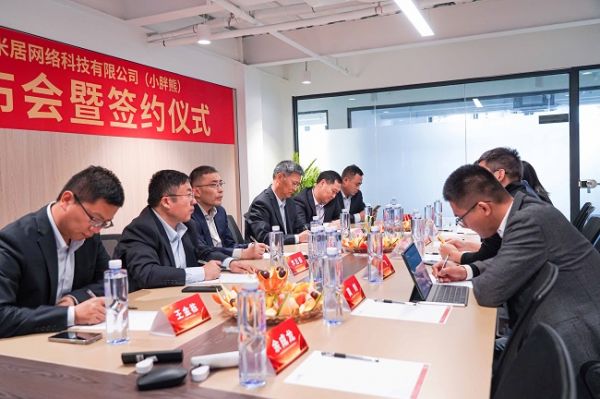 2021 年 11 月 15 日上午, 泰山石膏有限公司总经理任利及泰山石膏(华东)公司总经理张彦修等领导成员一行来访小胖熊总部,上海米居网络科技有限公司(小胖熊)CEO牛大龙率队进行了亲切接待!双方就合作事宜和发展方向做了深度会晤,并完成了战略合作协议的签署,双方核心领导成员悉数出席,共谋商计!
