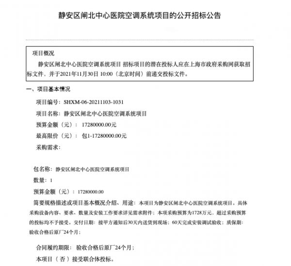 近日,全国各地政府采购信息网公布空调电器行业最新采购项目信息,涉及多个领域,总金额约八千多万元。其中,上海市静安区闸北中心医院空调系统公开招标项目预算1728万元,是本周预算最高的项目。