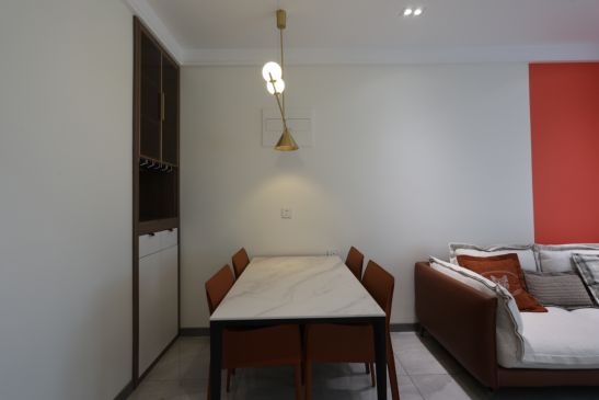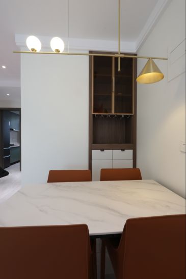 餐边柜定制的尺寸恰好可以放入客厅的空隙,柜中预留了空层和台面,餐具和用品的摆放空间增大,简直是储物和设计的完美结合。