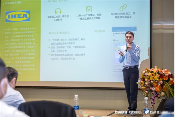 成院长将互讯针对家具企业的“三点一面”的解决方案做了详细解读,第一点对内,管好员工、管好资源,解决内部的工作协同,通过数据驱动组织执行;第二点to B,主要解决企业数字化的品质提升和数字招商问题;第三点to C,赋能终端,助力经销商“开一家店,卖一座城”。为经销商提供“千城千店,千店千面”的能力,让每个经销商都有自己的专属线上门店,收款专属、数据专属、店面专属、活动专属、直播专属……