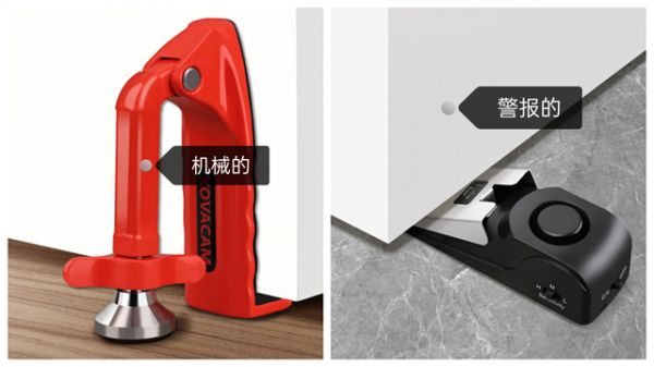 有机械式阻门器和警报款阻门器,机械式地更加牢固一些不易被推开,而警报款阻门器的警报声能一定程度上吓走坏人。