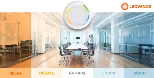 据调查,现代人平均86.9%的时间都是在室内活动,对人造光源的依赖程度已远超自然光,这使得照明企业基于“健康”理念研发产品与创新技术时,必须把“人”作为核心考虑的因素。自2017年承接了欧司朗全部通用照明业务并开始独立运营的朗德万斯,早在2018年的法兰克福照明展上就率先向世界展示了基于人因照明的办公室场景,这一场景可以根据一天当中不同时间段用户的不同需求,通过无线控制器自由切换情景模式,不同的情景模式对应灯具不同的亮度与色温输出,以此尽可能地模拟动态的自然光效果,让用户获得更舒适、更契合生理节律的光照体验。