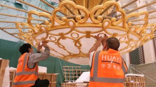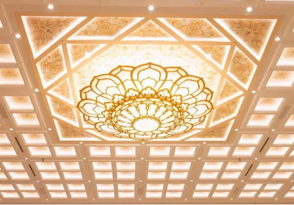 而选材难度大、工艺复杂、工时高度紧张,为本次项目带来了巨大的挑战。在中央大厅装饰吊灯上,华艺照明团队采用了精选铜质材料、雪花石与LED光源的组合方案,并为了克服雪花石的重量难度,采用了传统的“金镶玉”工艺,前后开模高达上百套。华艺照明项目团队,以三班倒的机制,对每一块雪花石进行仔细打磨,以40个工作日的时间完成了120日工期的工作,最终整体达到了设计师的要求。