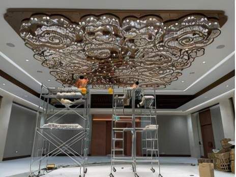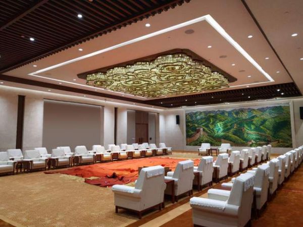 多功能厅装饰吊灯选用了不锈钢钛金钢材与国家一级精挑水晶制成,以“渊源共生、和谐共融、祥和安宁”为设计理念,打造出华夏祥云团簇之势,象征着党与国家百年奋进的千秋伟业,表现出对下一个一百年的美好希冀。