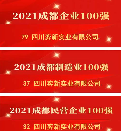 2021年11月26日,由成都企业联合会主办的2021第十一届成都百强企业榜单发布会在蓉举行。四川弈新实业有限公司荣获四项殊荣:“2021年成都制造业100强”、“2021成都民营企业100强”、“2021成都民营企业就业20强”。