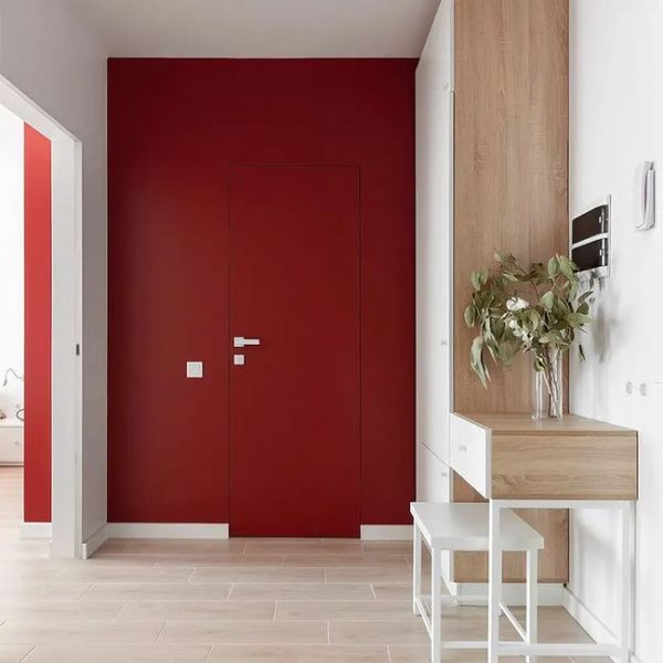 像是卧室的红墙上放了对比鲜明的圆形白框镜子