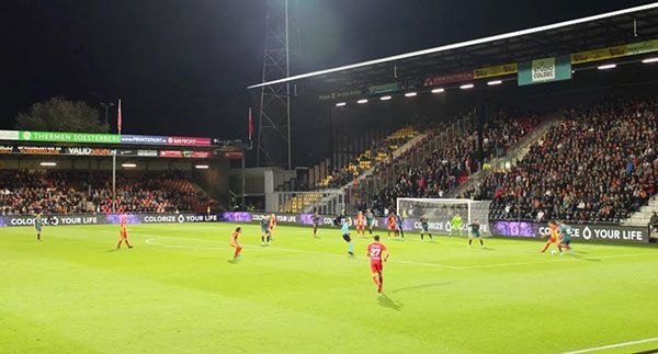 荷甲“前进之鹰”的比赛现场。在球场看台的顶棚悬挂着显眼的荷兰蔻帝(COLDEC)品牌标志
