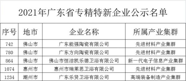 12月2日,2021年广东省专精特新中小企业名单公布。在企业自愿申报基础上,经地市推荐、专家评审、征求意见等程序,1393家企业通过了遴选,其中有5家陶卫企业榜上有名。