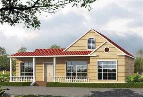这款房屋的外观看起来非常温暖、舒适。外墙采用的是黄色的墙砖,这样既降低了施工难度,又可以增加房屋的亮度,给人眼球一亮的视觉感。白色的入户柱、栏杆和屋檐,则可以起到点缀和隔离的效果。红色的瓦片,可以让房屋颜色更加的丰富。格子窗的设计,可以增加室内的采光和通风,让业主居住起来更加的舒适