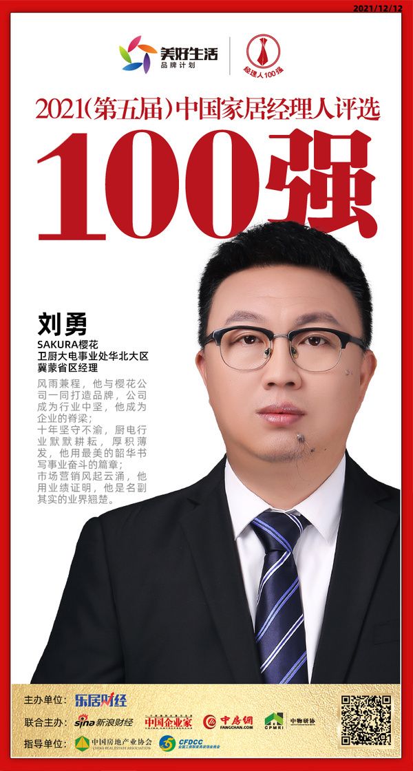 新浪家居讯 12月12日,2021(第五届)中国地产新时代盛典在北京举行,“2021中国家居经理人100强”榜单正式揭晓。SAKURA樱花卫厨大电事业处华北区冀蒙省区经理刘勇荣获“2021中国家居经理人100强”。