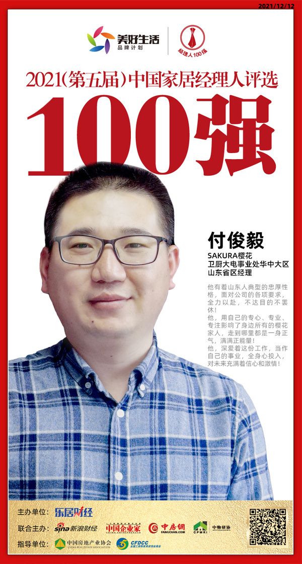 新浪家居讯 12月12日,2021(第五届)中国地产新时代盛典在北京举行,“2021中国家居经理人100强”榜单正式揭晓。SAKURA樱花卫厨大电事业处华中大区山东省区经理付俊毅荣获“2021中国家居经理人100强”。