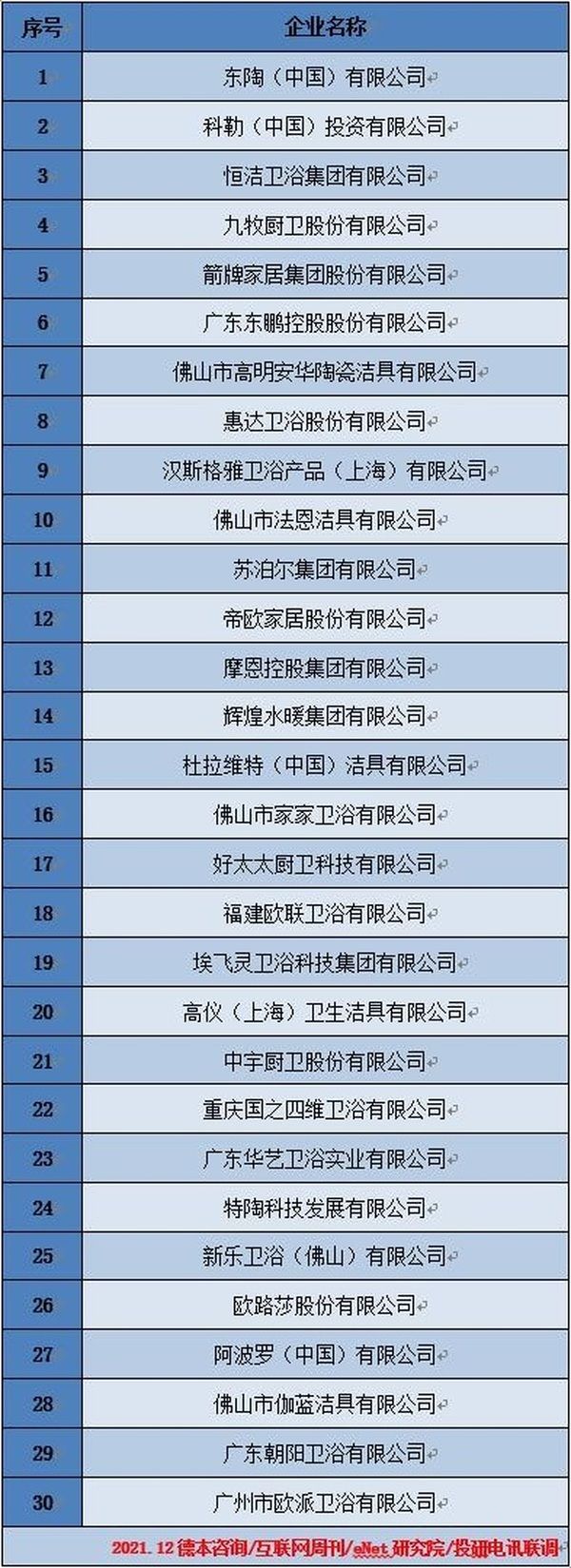12月12日,由德本咨询、eNet研究院、互联网周刊、投研电讯四家智库机构联袂评选推出的“2021中国卫浴品牌售后服务企业30强”榜单正式发布。在初选预评基础上,东陶(中国)有限公司、科勒(中国)投资有限公司、恒洁卫浴集团有限公司分获中国卫浴品牌售后服务企业前三名。