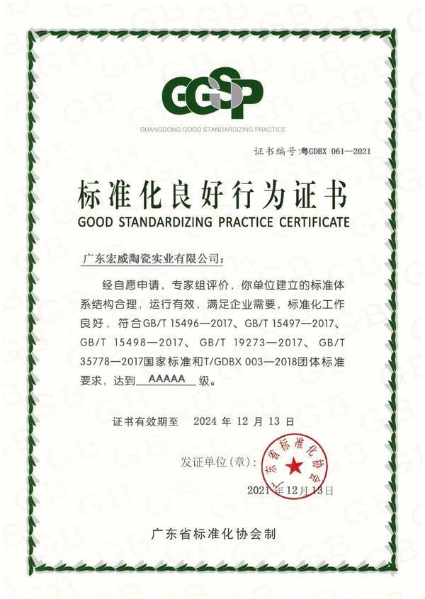 12月13日,经专家组依据《企业标准体系》系列国家标准和广东省标准化协会团体标准评价确认,广东宏威陶瓷实业有限公司通过标准化良好行为AAAAA级企业复审。