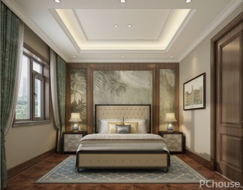 卧室作为休息的场所整体设计实木色偏少,床以及床头柜体均采用浅卡其色作为主色,相较于客厅和书房给人一种更加安静温馨的感觉。床头背景墙采用植被图案进行装饰,给了整体空间不一样的色彩,让看见看起来更加明亮,有活力。