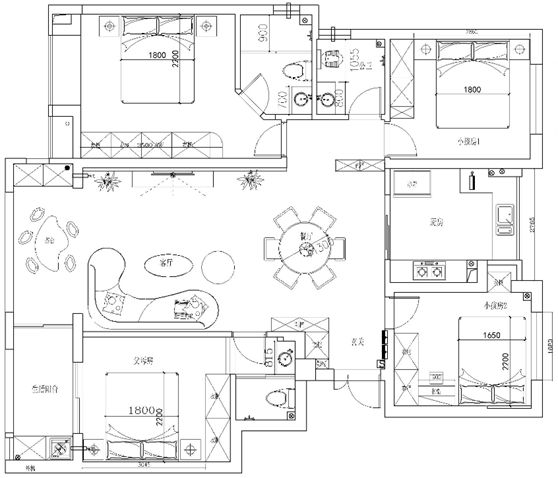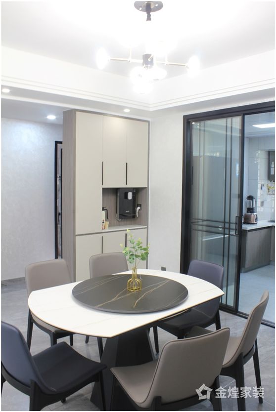 一侧的餐边柜兼具收纳和展示,以及重要的区域分隔功能,应对原始户型的缺陷,设计师巧妙的用整体柜的设计,化解了客卫直对入户门的缺点。