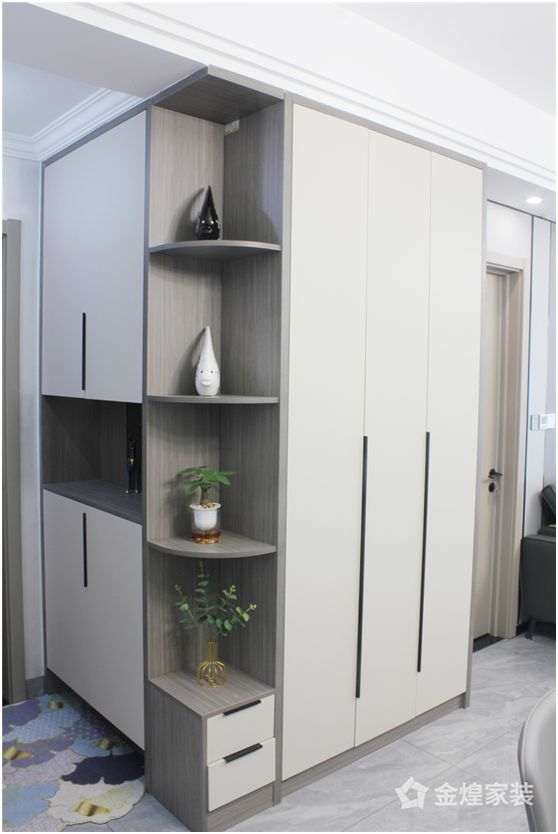 入户玄关处采用整体柜设计,下面留空10CM,可放出入鞋。平整的封闭柜门,隔绝灰尘,掩盖凌乱,开放位置则可放小件,在转角后段做延伸衣柜设计,便于悬挂衣物,增大收纳空间,满足一家人的需求。