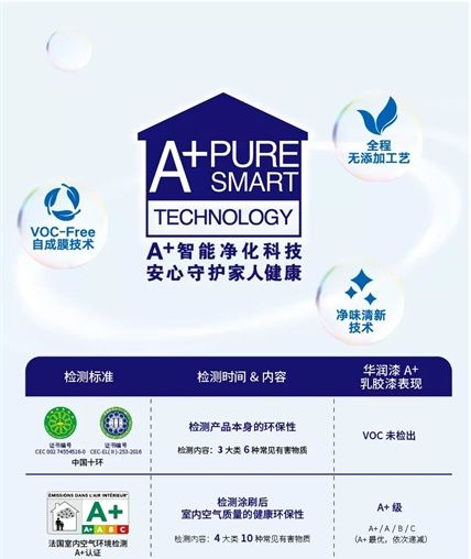 近年来,华润涂料坚持先进环保的科技研发和严格的内部评测标准,持续推出了获国际权威机构认证的产品系列。比如华润漆纯境A+系列产品,通过国际权威机构的检测,率先获得法国A+标准:它模拟人们实际居住的室内环境,使用专业精密仪器持续28天监测涂刷后的空气质量,针对VOC等有害物质的浓度对产品评级。不仅如此,华润漆还有独家的A+智能净化科技:采用全程无添加工艺、净味清新技术,以及自成膜技术,保证产品从生产到涂刷、乃至涂刷后的室内空间都能清新环保。