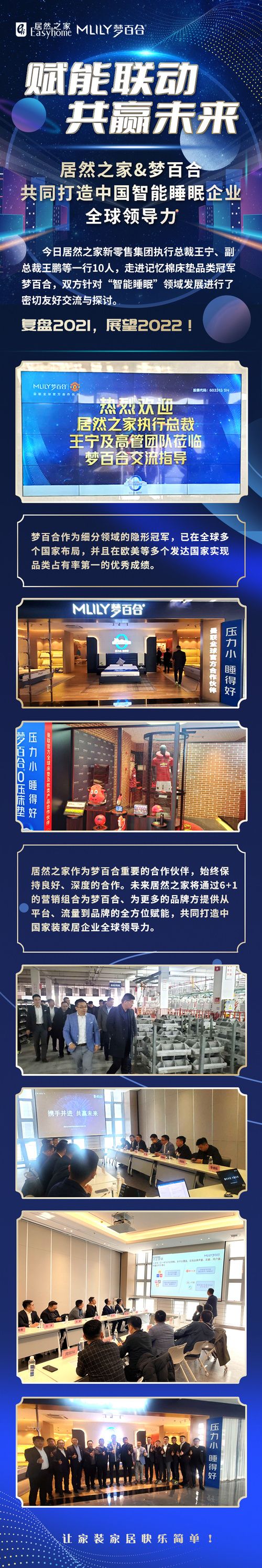 新浪家居讯 12月20日,居然之家新零售集团执行总裁王宁、副总裁王鹏等一行10人,走进梦百合,双方针对“智能睡眠”领域发展进行了密切有好的交流与探讨。据悉,双方长期保持着良好、深度的合作,未来居然之家将通过6+1的营销组合为梦百合以及更多品牌方提供从平台、流量到品牌的全方位赋能,共同打造中国家装家居企业全球领导力。