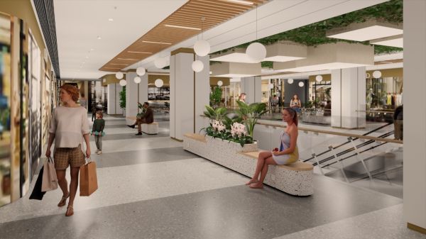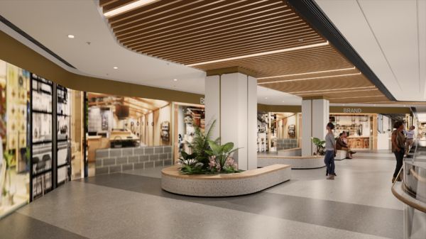 根据空间结构的特点,以各层转换层的墙体特装为线条过渡载体,采用带有石雕线条过渡的空间纹理,又具有局部视觉割裂的空间解构感,并针对各区域、各业态天花结构进行线条解构的融合,给消费者创造出更为可逛的空间形象。