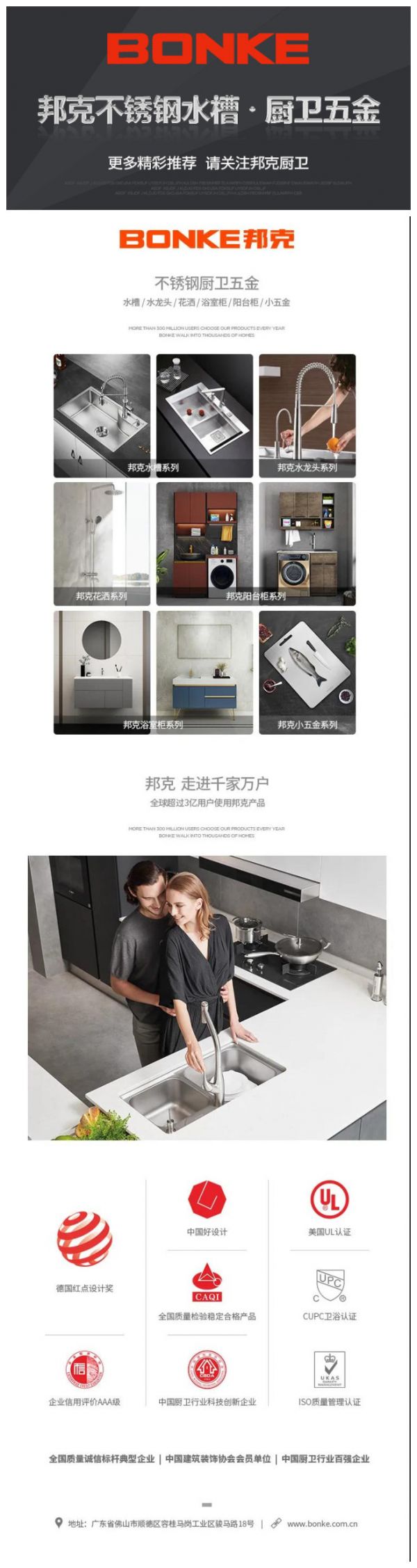 首先是在把单品做强,基于自身已有核心竞争优势的卫浴和厨卫两个领域做边界延伸,产品线从传统厨卫产品延伸到厨房智能五金等,打造邦克整体厨房和浴室方案。同时,邦克突破材料运用和外观设计的边界,衍生空间审美新维度,将消费者从现在厨房、卫浴中冰冷、刚硬、杂乱的环境中解放出来;还给用户真正家的感觉,使厨房与餐桌之间、卫浴空间成为新的家庭交流中心。