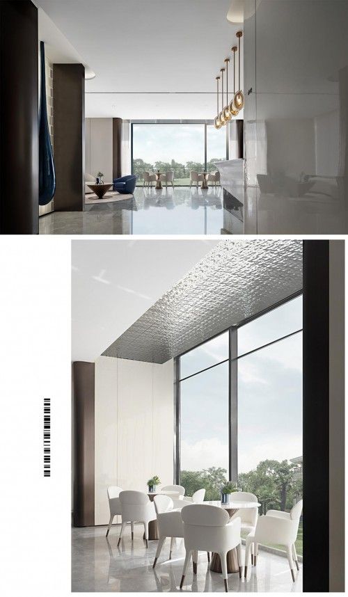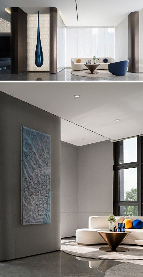 不拘于形式,不露于表象。远看沙盘区的天花吊灯,运用线条的不同性格,曲线的动感与旋转,赋予空间多变的情绪,让人产生流动的时光感和力量感。白色蕴含静谧,宝石蓝潜藏活力。动静之间相得益彰,带来视觉的多感官享受。洽谈区内的装置初看不起眼,下一秒玄机立现——宝蓝色的水滴装置奇幻感十足,镜像世界里也许还埋藏着未知场域。