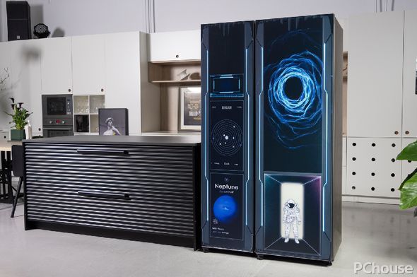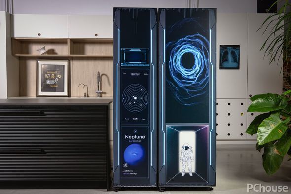 设计师在冰箱上模拟出一场奇幻的太空旅行。冰箱左上方“设置”了一处插卡口,作为身份认证识别;“识别成功”后,接下来就可以开始选择太阳系内行星目的地了,如今显示的目的地是太阳系中最遥远的行星——海王星。人们则可以通过冰箱右上方设计的虫洞,实现星际航行。特别的是,右下方保留了冰箱原本的白色玻璃面板,犹如科幻片中瞬时穿越的白光,搭配穿越虫洞通道而出的宇航员,每一次开启冰箱,仿佛都在经历了一次奇妙的宇宙航程。