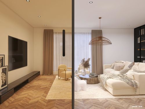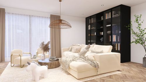 线条清晰的地板与圆润形态的茶几形成相互映衬,勾勒出诗意盎然的意象,在德立全景门的加持下仿佛一张寓意丰富的画卷。