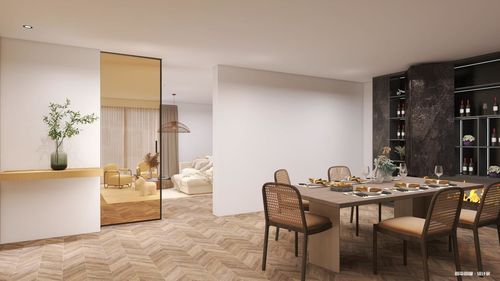 品茶之余,亦不能辜负美食。餐厅的品位也因茶玻全景门而随之提升,木制餐桌和灰棕色座椅,在明朗的线条中寻找到统一的表达,让餐厅多了份难得的亲密感,透过全景门看到的,则是餐厅之外的另一种延伸,空间也由此变得丰盈起来。
