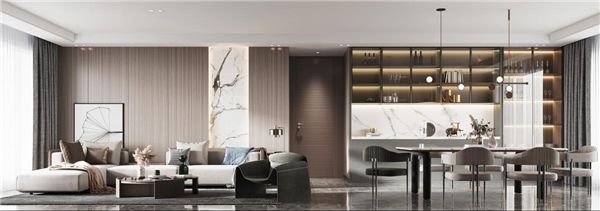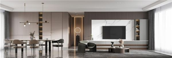客厅电视背景墙采用白色大理石背板,简约大气。电视柜与长城板的搭配让空间更加富有层次感。一体化客餐厅动线合理,统一色系让整个空间更加开阔。
