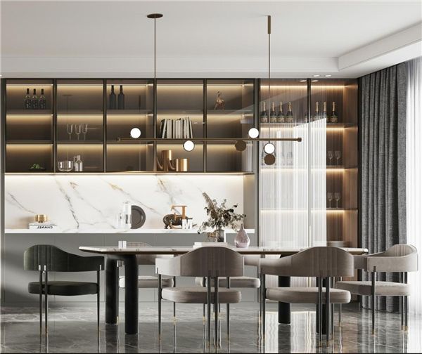 梵客系列将实用性与美结合在内隐式把手上,酒柜玻璃门设计将储物与展示完美结合,方便收纳的同时还增加了艺术气息。大理石背板让空间更加简约与整洁。