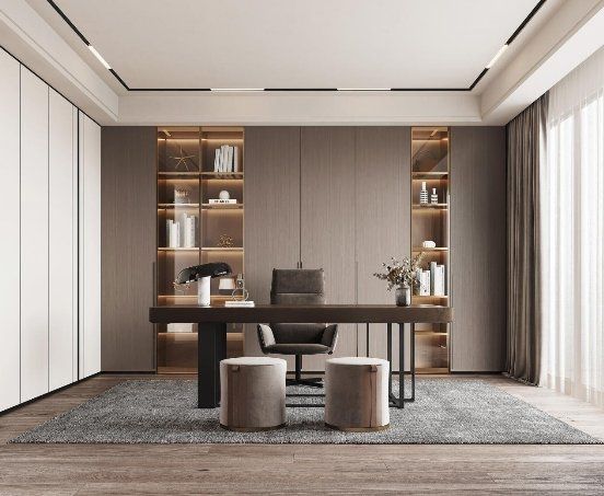 书房采用原木纹理的墙板,让人仿佛置身于大自然,摒弃屋外的浮华,放慢节奏,专注思考,回归生活的本真。低饱和度色系与极简的线条呈现出现代主义的高度理性,玻璃反射的光线让书房更添一丝灵动。