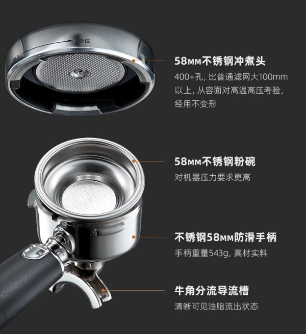 除了精准的控温和高压的萃取系统,东菱研磨一体咖啡机还顾及到提升和稳定口感的加分功能。东菱研磨一体咖啡机的冲煮头、粉碗、手柄均做到商用级标准的58mm大口径,不锈钢的材质更可从容面对高温高压考验,远超众多家用机性能,让咖啡技术控在家也能享万元高配机体验,带来星级咖啡品质。