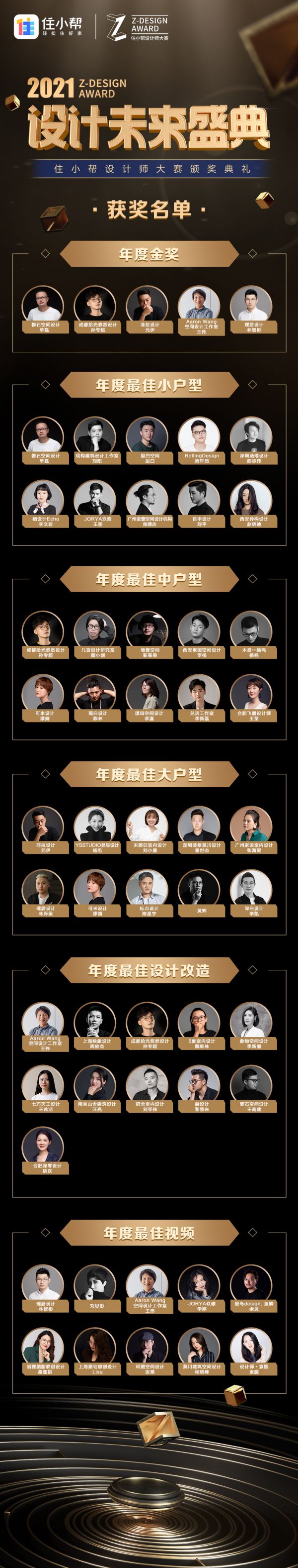 住小帮首届设计师大赛自2021年7月启动以来,经过长达近半年的报名、城市巡讲、评审团评审,共吸引来自华北、华东、华中、华南、西南五大地区的600余位设计师报名参与角逐,他们通过图文赛道、视频赛道共计提交了超过2000套设计作品,最终有178套作品荣获地区奖项,另有51位设计师荣登年度最佳得主名单、5位设计师摘得大赛金奖得主称号。