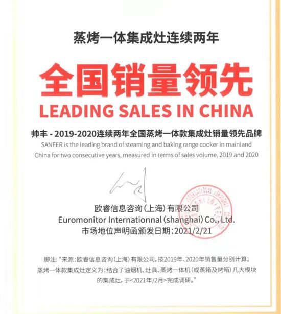 2月21日,帅丰获欧睿信息咨询(上海)有限公司权威声明“帅丰-2019-2020连续两年全国蒸烤一体集成灶销量领先品牌”,产品销量领跑行业。