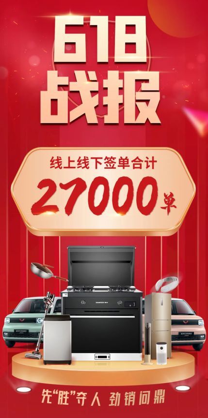 618活动首日,帅丰集成灶天猫旗舰店总成交量第一,截至活动结束,帅丰在竞争激烈的集成灶品类中大获全胜,全网总销量达27000台。