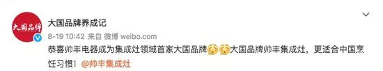 8月19日,帅丰电器成为集成灶领域首家CCTV大国品牌企业,向世界传递有温度、有情怀的大国品牌形象。
