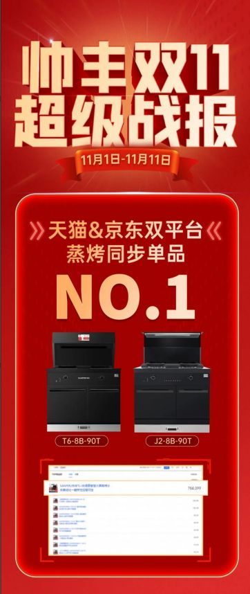 双十一期间,帅丰T6与J2双子星夺得天猫&京东双平台蒸烤同步单品NO.1,天猫旗舰店销售额1亿+,店铺排名TOP2,以实力再创销量神话。