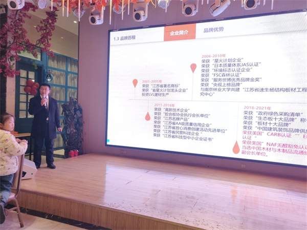 随后,福庆家居健康饰材事业部销售经理王贺,为各位来宾介绍了福庆企业发展及品牌运营概况。作为实木快装材料品牌运营商,福庆家居专注木制品行业31年,现已发展成为江苏省最大的装饰建材家居企业,更是凭借着高质量的产品走出国门,出口日本板材总量连续15年行业领先!