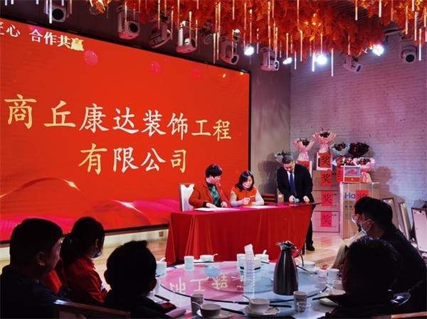 会议中,上海水木石装饰集团、商丘市蒲公英装饰工程有限公司、河南螳螂家装饰工程有限公司、商丘康达装饰工程有限公司纷纷与福庆定制家商丘总经理冀总现场签约,标志着双方合作走上了一个新的台阶,在今后的合作中,双方将紧密合作,互利共赢,开启家居定制行业新篇章。