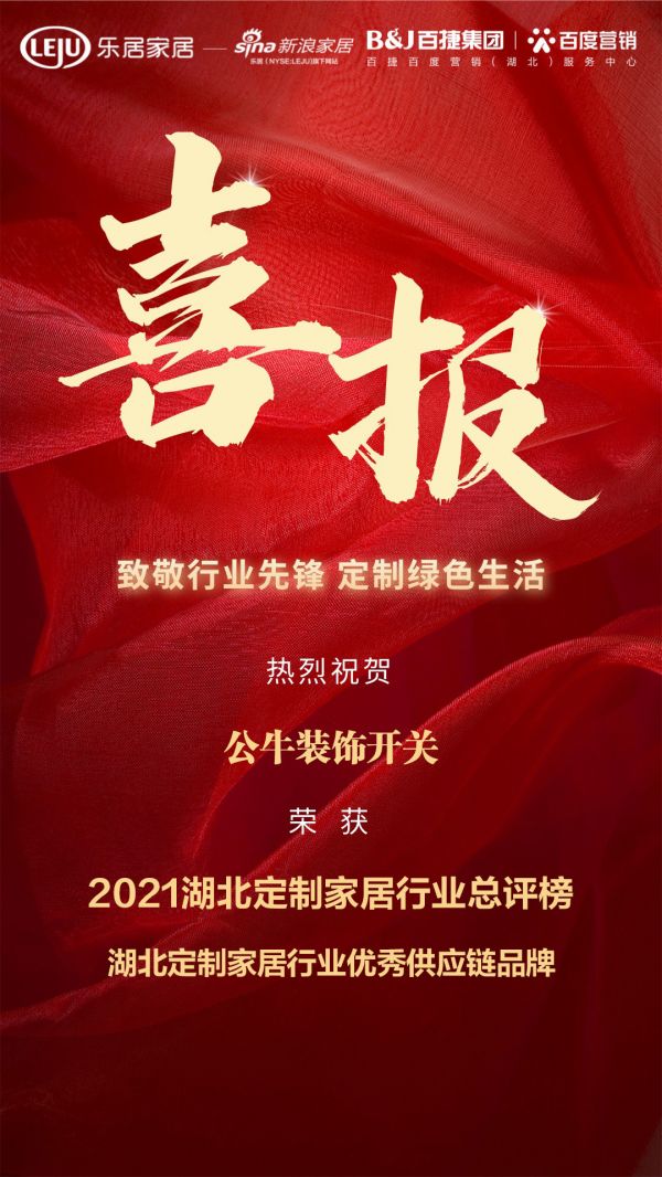 喜报|公牛装饰开关荣获2021湖北定制家居行业优秀供应链品牌