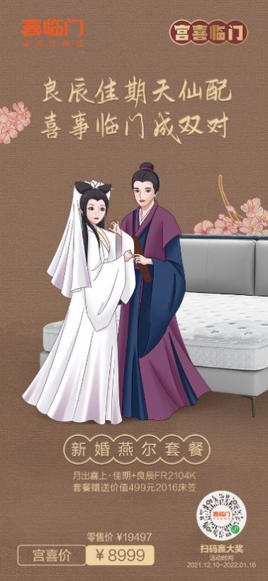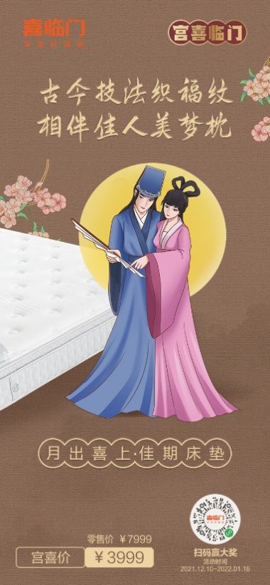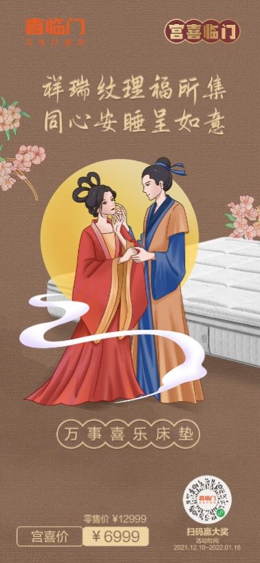 在此前喜临门发布的古代CP人物系列海报,设计灵感来自于中国传统的神话故事。此次“宫喜临门 青春当潮”的大促活动下,故宫文化和喜临门联名推出包括“万事喜乐床垫”、“月出喜上-佳期床垫”、“新婚燕尔套餐”等精美产品。