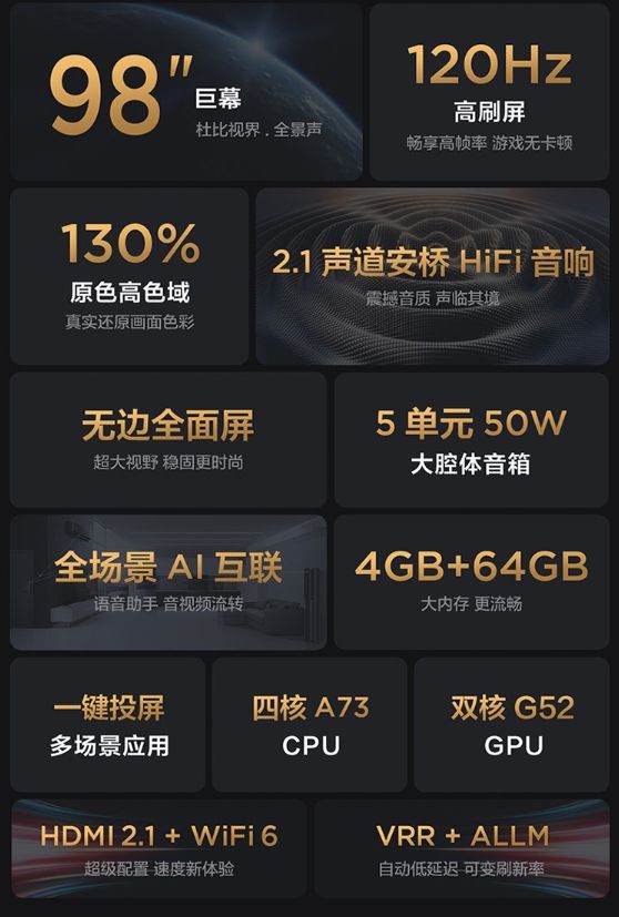接着来到硬件配置方面,TCL 98Q6E IMAX Enhanced巨幕智屏堪称豪华,采用MT9652高端处理器和四核A73架构CPU、双核G52 GPU,配备4GB内存+64GB存储空间;支持最新的WIFI 6规格,无论是操作响应速度还是联网速度,都如丝般顺滑流畅。而且它还搭载一个HDMI 2.1接口,可以输出4K+120Hz的画面,这可以说是PS5等主机游戏玩家的福音呀。